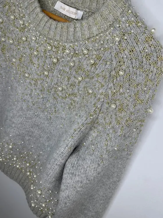 - Perlas en color crudo salteadas por el delantero y parte de los hombros.