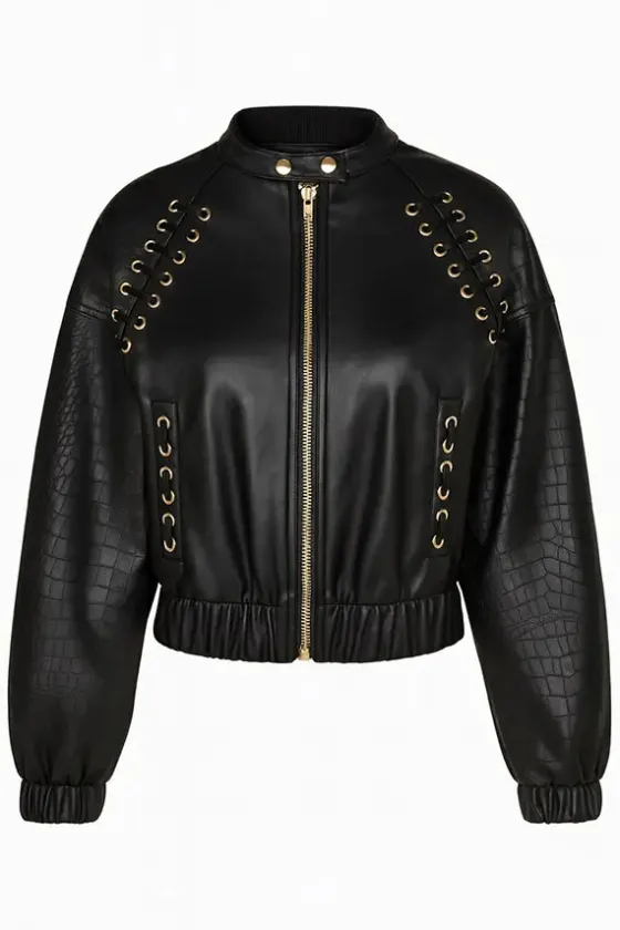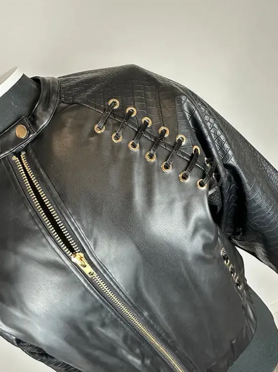 - Detalle de mangas en ecopiel efecto serpiente haciendo contraste con el resto de la prenda, en ecopiel lisa.