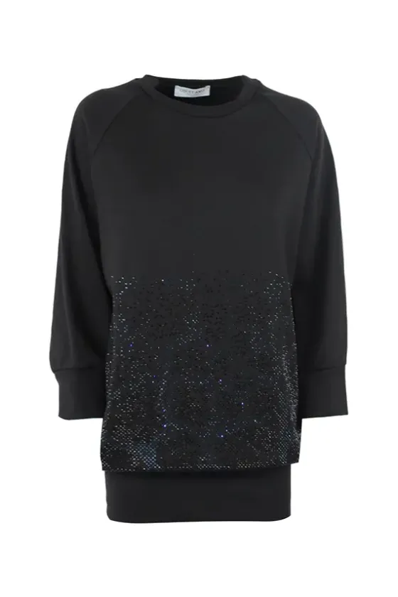 - Detalle en el delantero, mitad inferior, de strass en negro. Lo que le aporta luz y le da un toque m谩s glamouroso, d谩ndole versatilidad a la prenda.