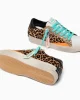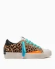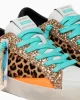 - Parte superior de piel de becerro con estampado de leo y detalles de charol en color naranja fluorescente y brillo dorado.