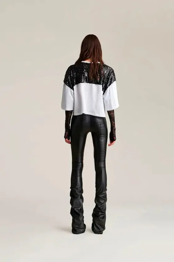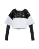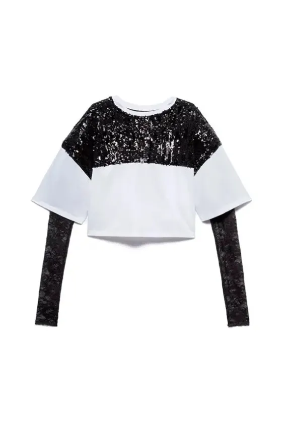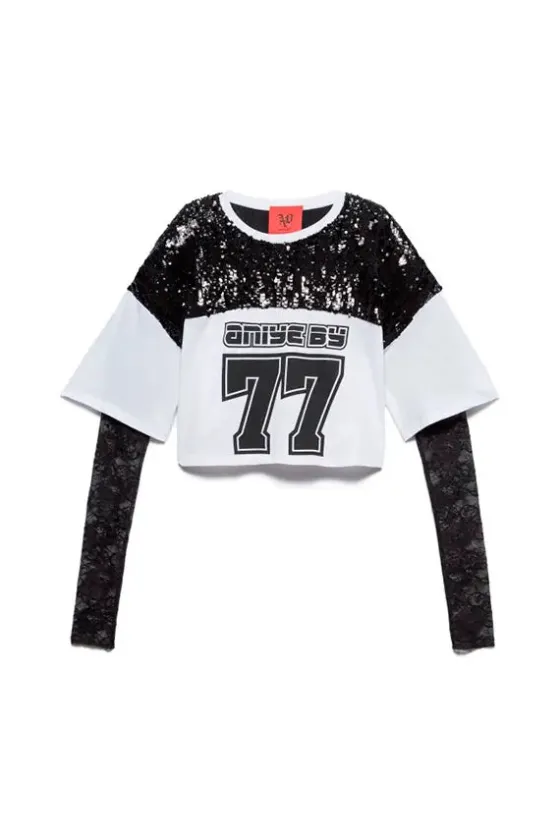 La camiseta de rugby Aniye combina un corte atl茅tico con detalles femeninos. El cuerpo de algod贸n presenta un panel de lentejuelas en la parte delantera, con un logotipo estampado en el pecho, mientras que el cuello redondo mantiene el look limpio. Las mangas largas de encaje dan a la prenda un toque oscuro y elegante.