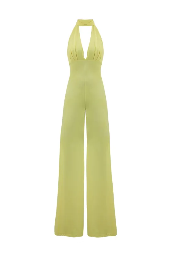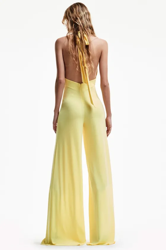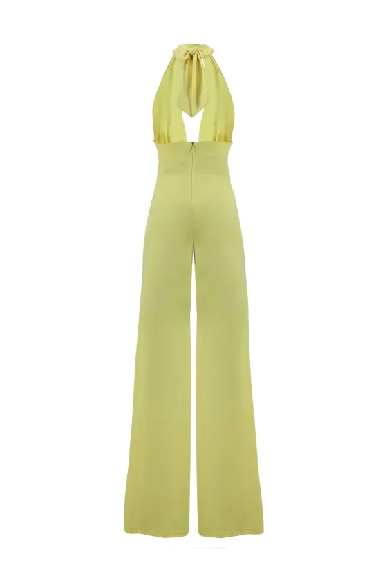 Mono amarillo, con escote V y lazada para anudar en el cuello. Palazzo con una caídamaravillosa.