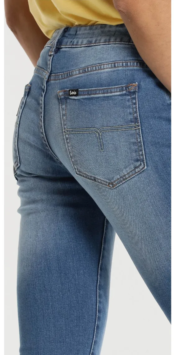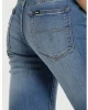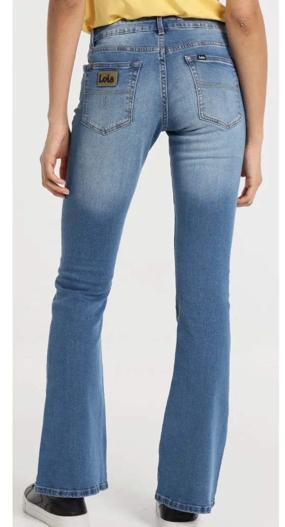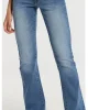 Pantalón vaquero azul, tiro medio. Ligeramente acampanado. Lavado y desgastado en delantero y trasera. Comodidad absoluta. 5 bolsillos.