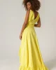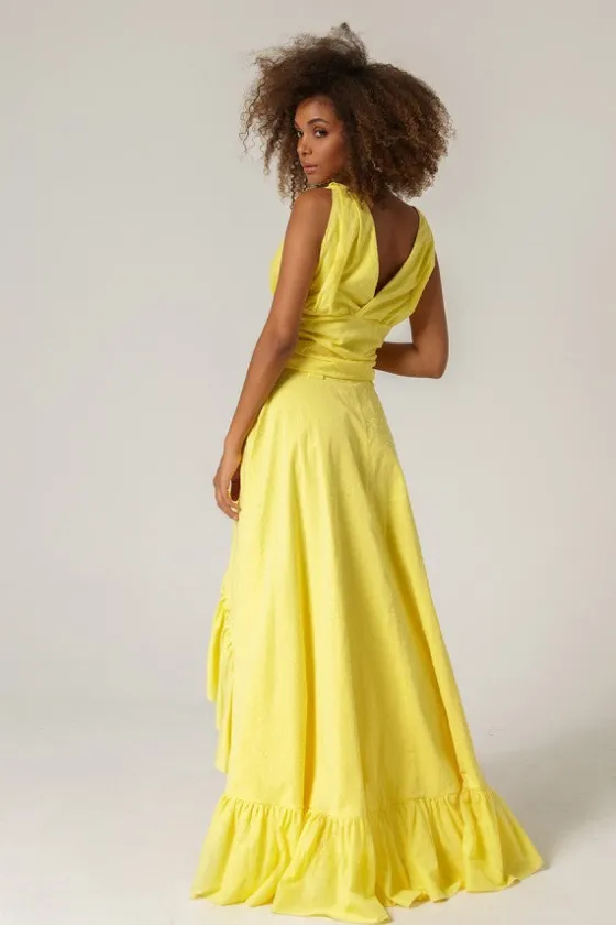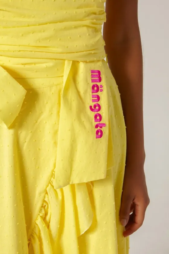 Top en tejido de algod贸n en color amarillo. Escote en delantero y espalda en forma de V. Faj铆n con bordado en tono fucsia. Cierre mediante cremallera lateral. Forro interior.