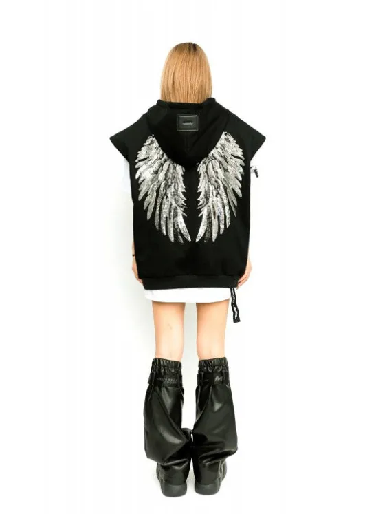 - Con parche de alas bordadas en lentejuelas cosido en la espalda.