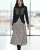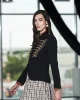 - Su patrón de americana se realza con un distintivo cuello mao y un delantero besado, cuyo cierre oculto con corchetes mantiene la fluidez del diseño, permitiendo que los botones dorados actúen como un elemento decorativo en perfecta armonía con el bordado.