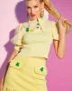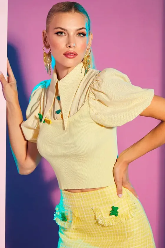 - Mangas y parte superior en tejido de camisa a rayas en amarillo y crudo.