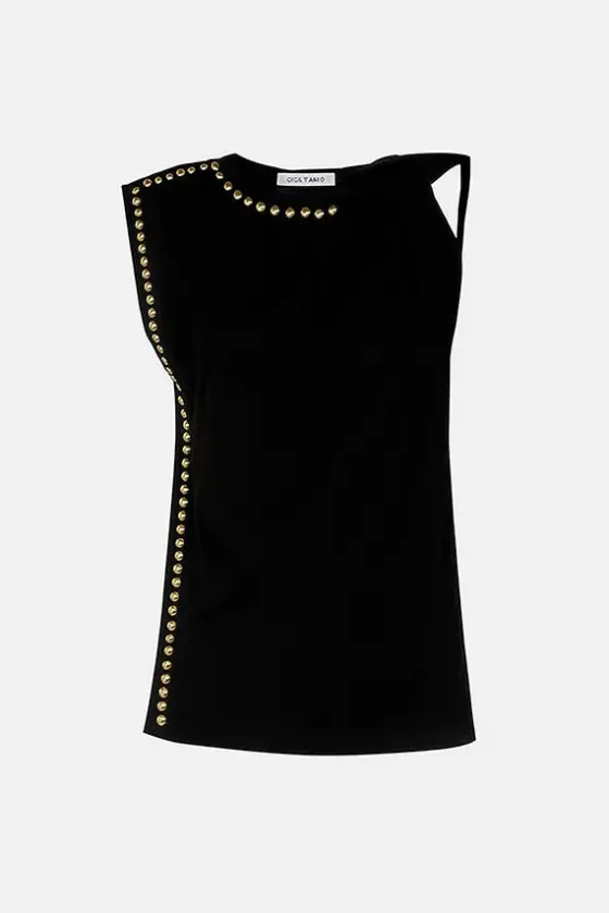 - La otra mitad bordeada con tachas doradas, desde el cuello hasta el bajo.