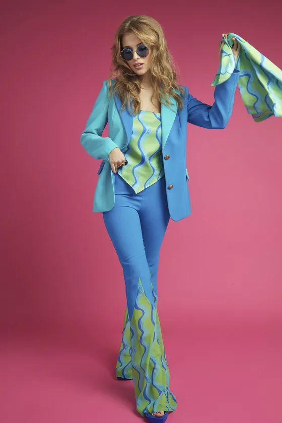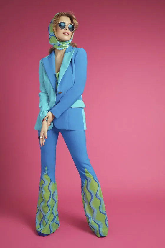 Pantalón campana, con mezcla de tejidos. Base en gasa con estampado personalizado de la marca. Ideal para combinar con el Topacio logos top y Topacio Blazer.